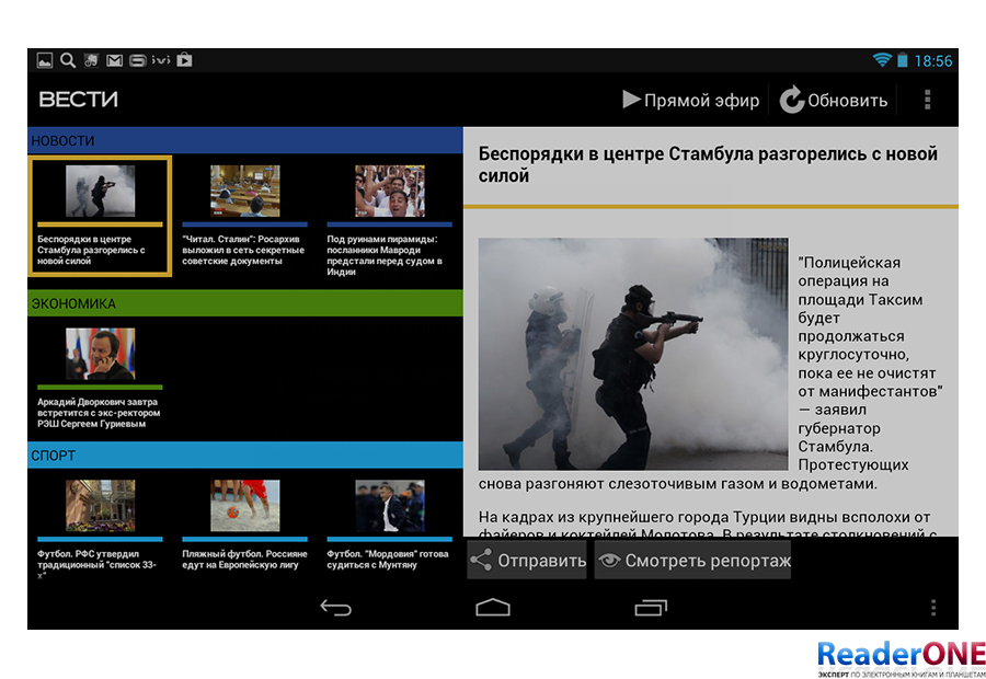 Помимо этого, на планшете имеются приложение для просмотра российских телеканалов - SPB TV. С его помощью можно смотреть популярные телеканалы, включая Первый, Россию, MTV, Ren TV, TV 3, RBK, Euronews и многие другие. Приложение демонстрирует программу передач каждого из каналов, для просмотра не требуется регистрация, но, естественно, необходимо подключение по Wi-Fi.